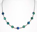 Decentní náhrdelník na řetízku z chirurgické oceli. Kuličky o průměru 1 cm. Délka řetízku cca 46 cm. Srůst 4 minerálů: Azurit, malachit, chryzokol, dioptaz Odstraňuje všechny negati...