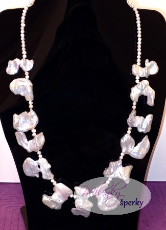Barokní perly 13 ks o velikosti cca 2 cm, proložené drobnými perličkami o průměru 0,2 cm.