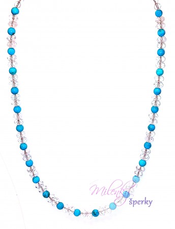 Hladké kuličky pravého tyrkysu o průměru 0,5 cm, prokládané hladkým křišťálem o průměru 0,5 cm.
